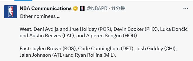 西部:阿夫迪亚和霍勒迪(开拓者)、布克(太阳)、东契奇和里夫斯(湖人)、申京(火箭)
